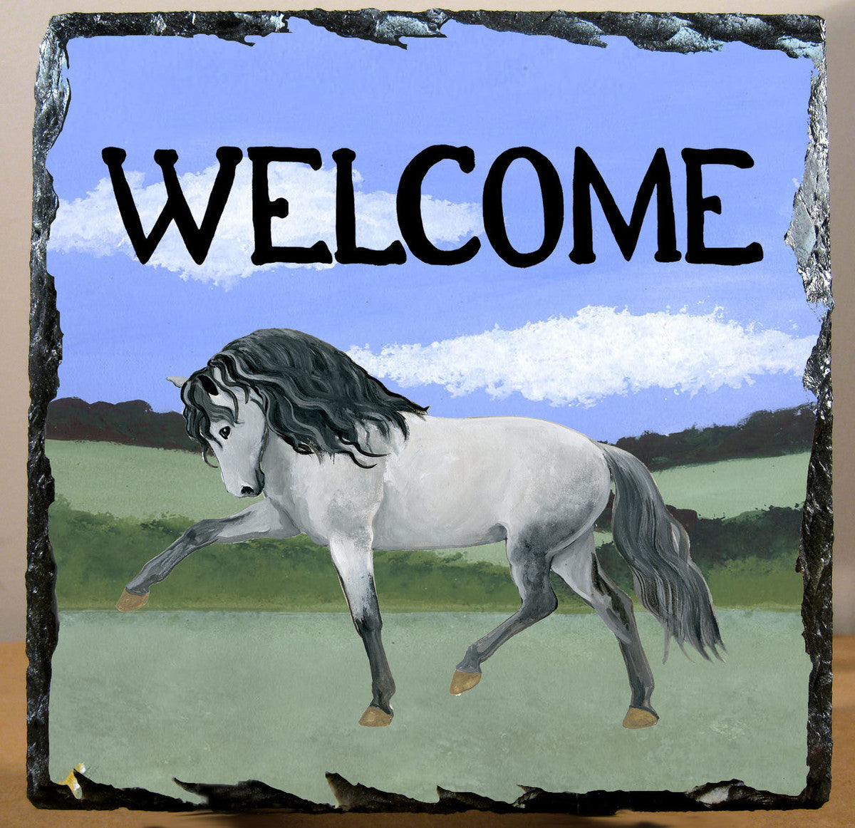 Our breed themed slates measure about 7.5 x 7.5 inches and are about 5/8 inches thick. They are drilled and fitted with a leather strap ready to hang.